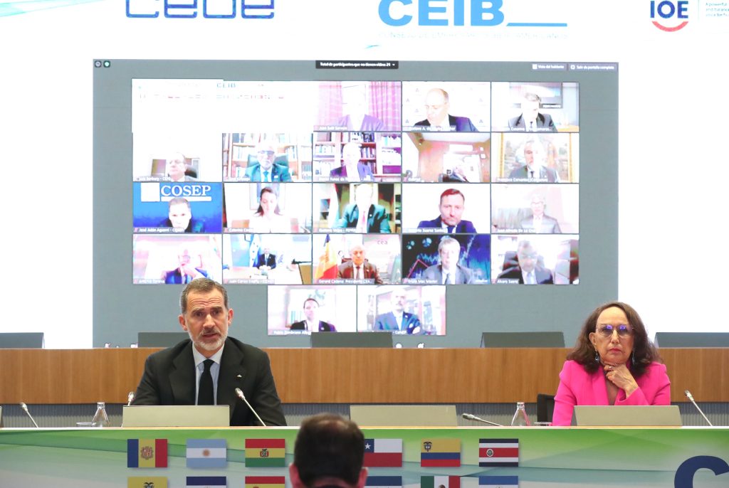 El rey Felipe VI de España presidió hoy una reunión con 23 presidentes de organizaciones empresariales CEIB-OIE, en un acto en el que también intervinieron la secretaria general iberoamericana, Rebeca Grynspan; la ministra española de Industria, Comercio y Turismo, Reyes Maroto; el presidente de la Confederación Española de Organizaciones Empresariales (CEOE), Antonio Garamendi; el presidente de la Organización Internacional de Empleadores (OIE), Erol Kiresepi, y el presidente del Consejo de Empresarios Iberoamericanos (CEIB) y de la Confederación Empresarial Andorrana (CEA), Gerard Cadena.