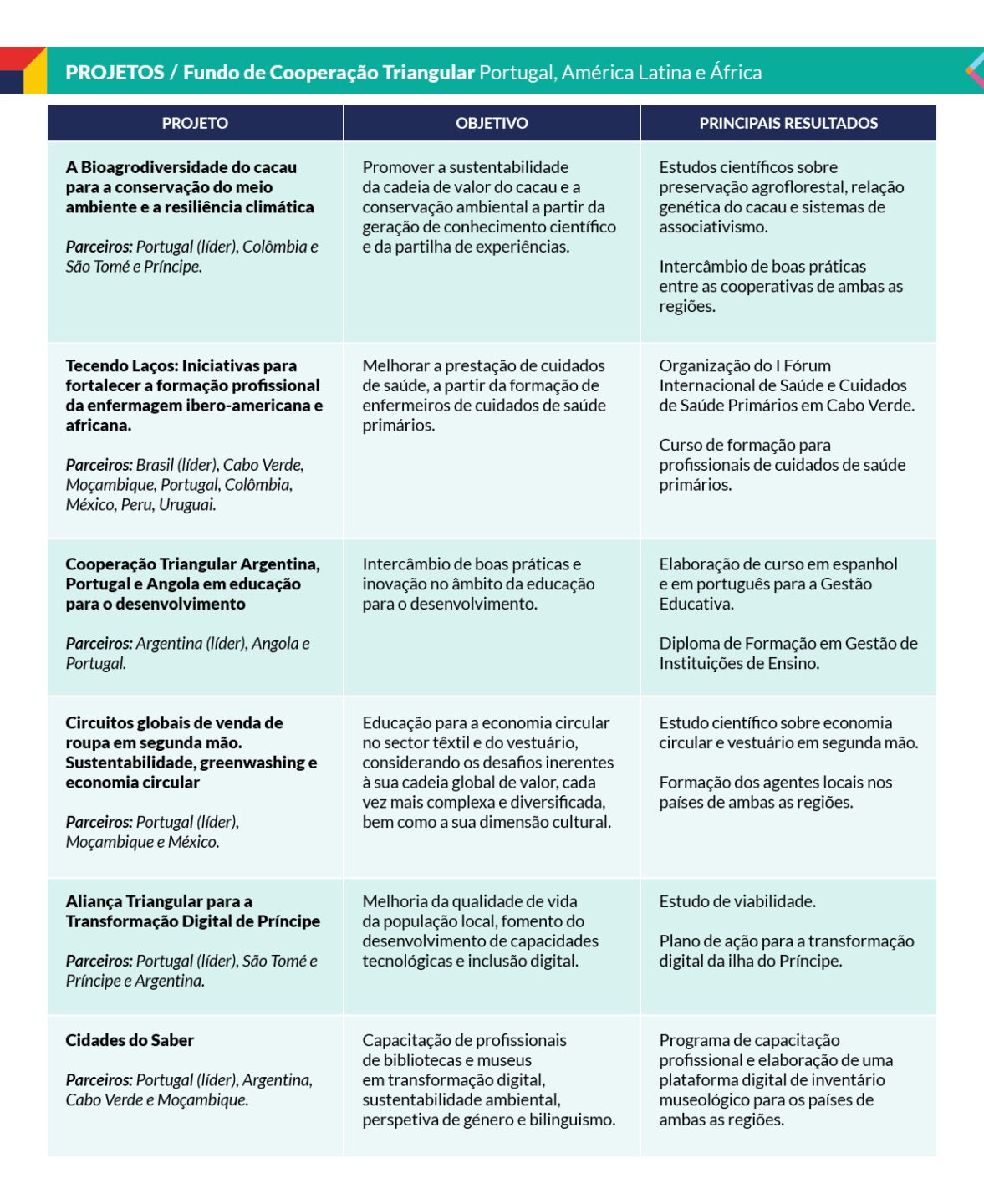 A iniciativa de estudo sobre a bioagrodiversidade do cacau, lançada em São Tomé e Príncipe, na qual participaram especialistas da Colômbia e de Portugal, serviu — por exemplo — para impulsionar o desenvolvimento sustentável na ilha africana e ajudar a fortalecer as organizações campesinas do país andino. Por sua vez, o projeto de roupa em segunda mão e economia circular colocou em contacto instituições do México, Portugal e Moçambique, com o objetivo de formar agentes locais nos países de ambas as regiões, enquanto a parceria entre Portugal, Argentina e São Tomé implementou um plano de transformação digital na ilha do Príncipe.