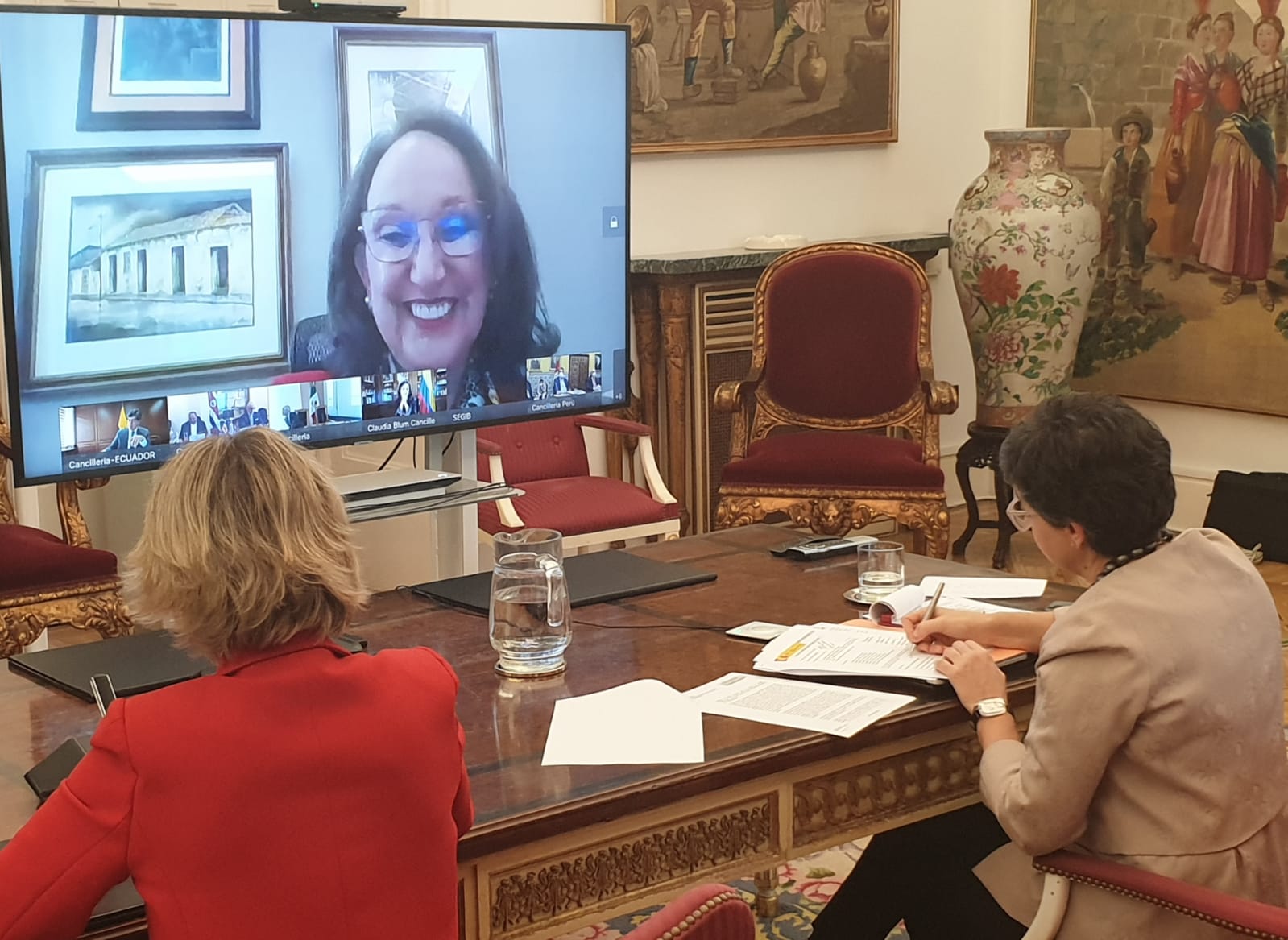 La secretaria general iberoamericana, Rebeca Grynspan, participó ayer lunes 20 de abril en una videoconferencia junto a la ministra de Asuntos Exteriores, Unión Europea y Cooperación de España, Arancha González Laya y los ministros de Asuntos Exteriores de Argentina, Felipe Solá; de Chile, Teodoro Ribera; de Colombia, Claudia Blum; de Costa Rica, Rodolfo Solano; de Ecuador, José Valencia; de México, Marcelo Ebrard; y de Perú, Gustavo Meza-Cuadra. Por parte española han intervenido, junto a la ministra González Laya, las secretarias de Estado de Asuntos Exteriores y para Iberoamérica y el Caribe, Cristina Gallach, y de Digitalización e Inteligencia Artificial, Carme Artigas.