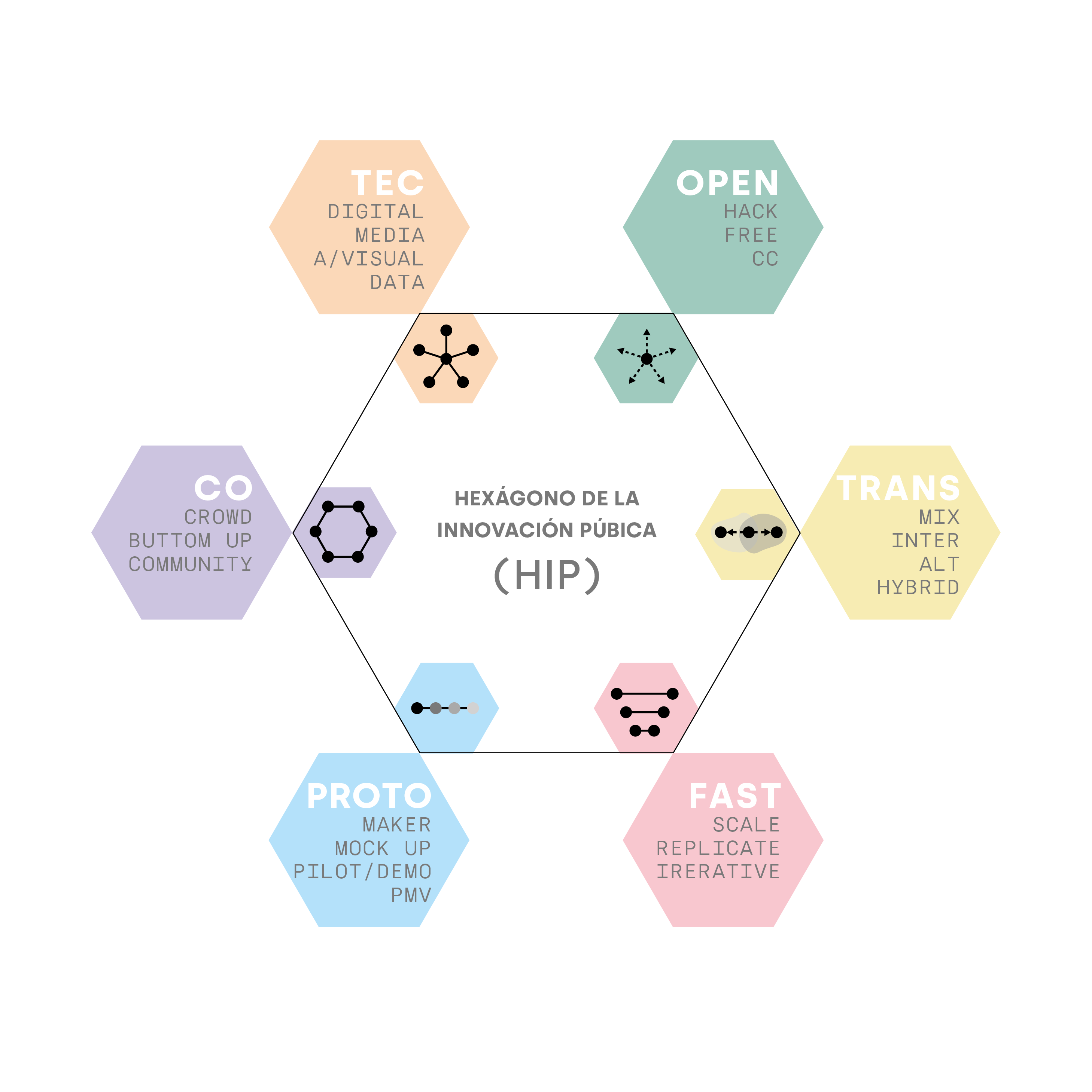 El Hexágono de la Innovación Pública (HIP) es el resultado del informe “Instituciones que Aprenden” diseñado para la XXVII Cumbre Iberoamericana de Jefes de Estado y de Gobierno y tiene el objetivo de acelerar la transición de las instituciones hacia organizaciones en red, abiertas, flexibles y democráticas.