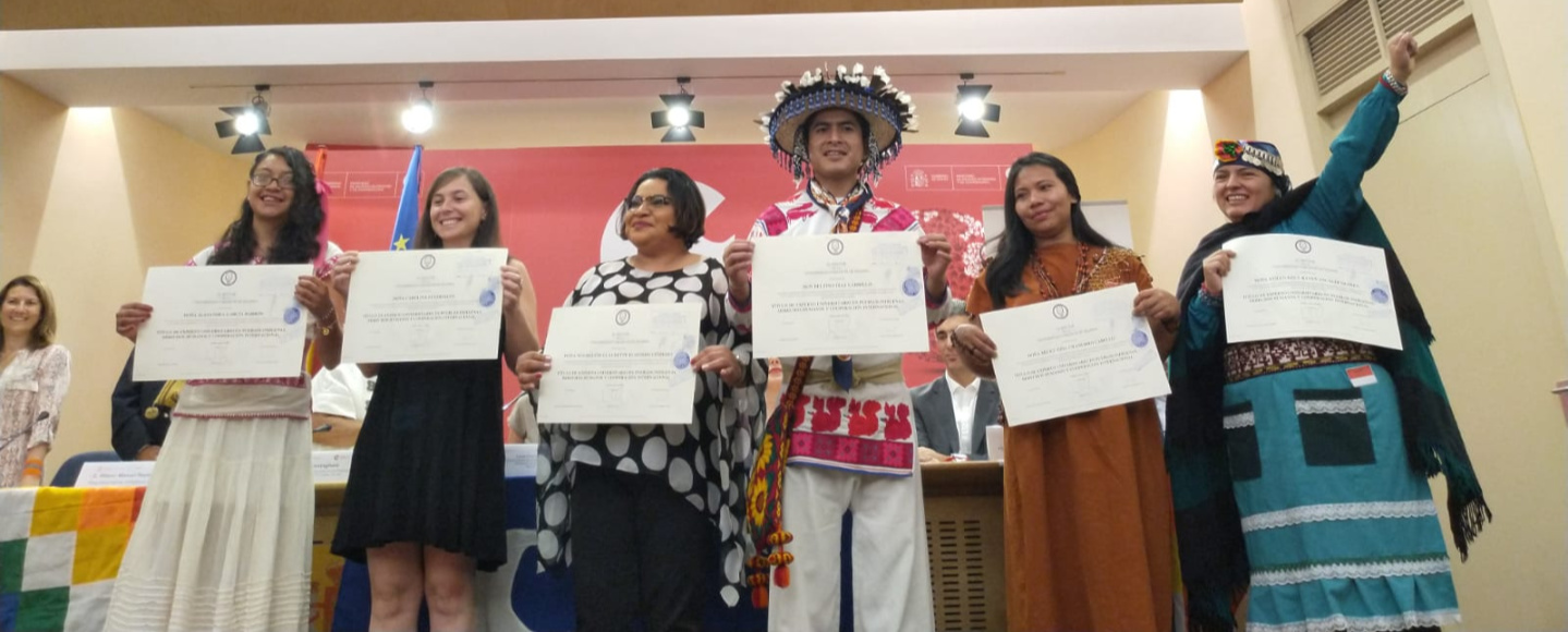 O ato de graduação se iniciou com uma invocação espiritual indígena a cargo dos alunos desta pós-graduação, seguida das palavras da presidenta do Fundo para o Desenvolvimento dos Povos Indígenas (FILAC), a chefa do departamento de Cooperação com Países Andinos e o Cone Sul da AECID, Laura Oroz Ulibarri, o codiretor do título Daniel Oliva Martínez, o coordenador da área de coesão social e Cooperação Sul-Sul da SEGIB, Martín Rivero; a embaixadora do México na Espanha, Roberta Lajous, o representante indígena do Chile perante o FILAC, Wilson Reyes e Carmen Albertos Ceano-Vivas, especialista principal em Povos Indígenas e Diversidade do BID.